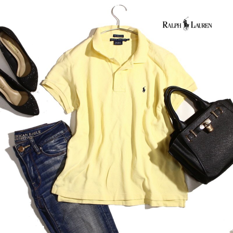 > 美品 ラルフローレン RALPH LAUREN 夏 The skinny polo スモールポニー 刺繍 鹿の子 ポロシャツ L / G イエロー 黄色 ネイビー 紺 半袖