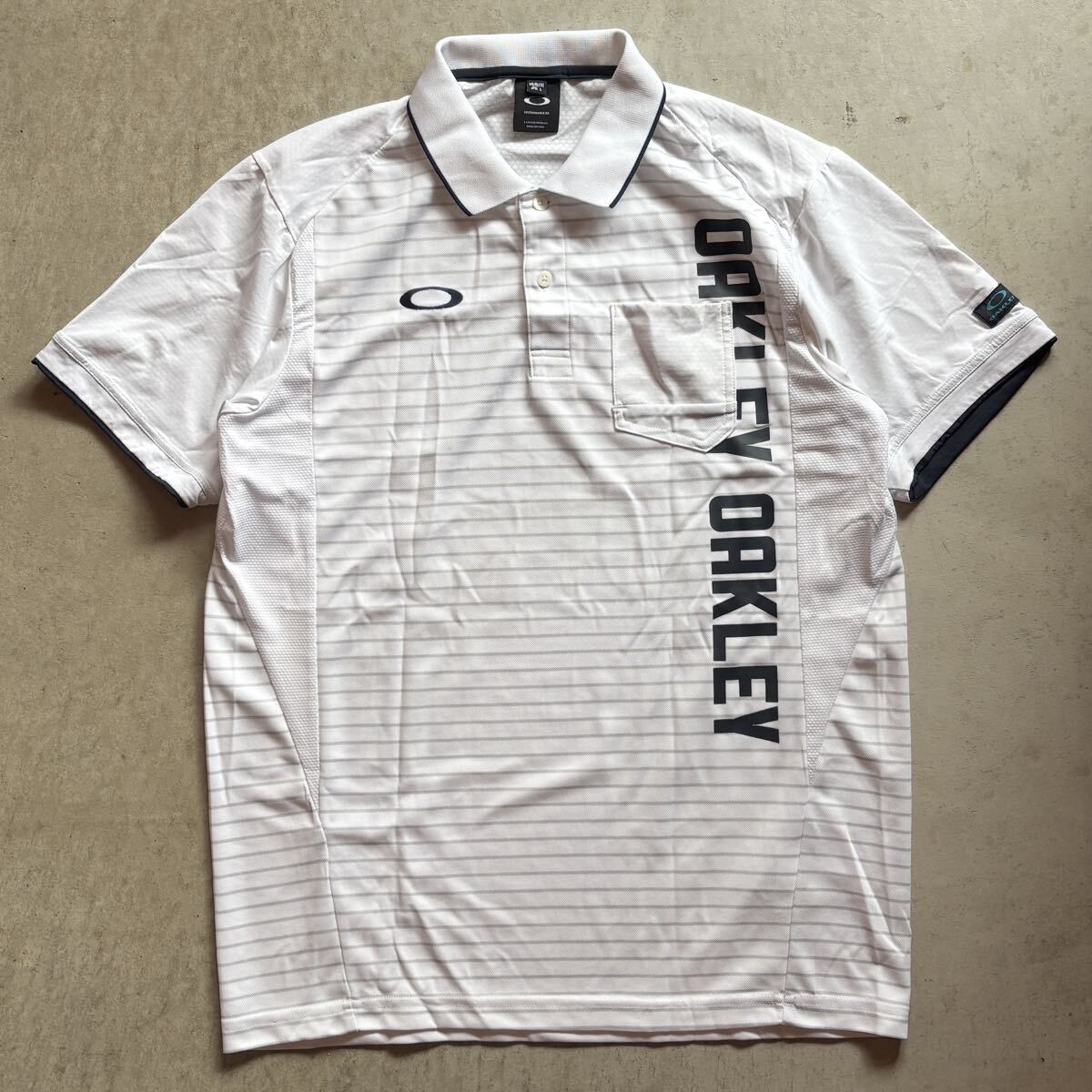 - 【美品】OAKLEY オークリー 半袖ポロシャツ GOLF ゴルフ ウェア メンズ L 白/WHITE ストライプ ロゴ プリント ストレッチ スポーツ 正規