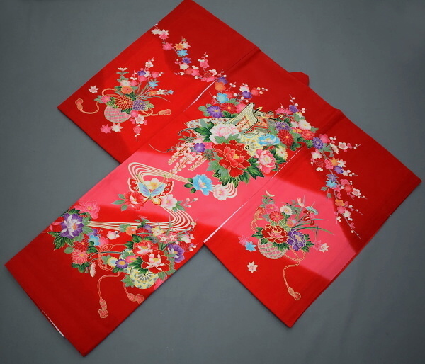 - A50-12【凛々】即決 中古品 正絹 お宮参り 女児 初着 祝着 赤 御所車 花 長襦袢付