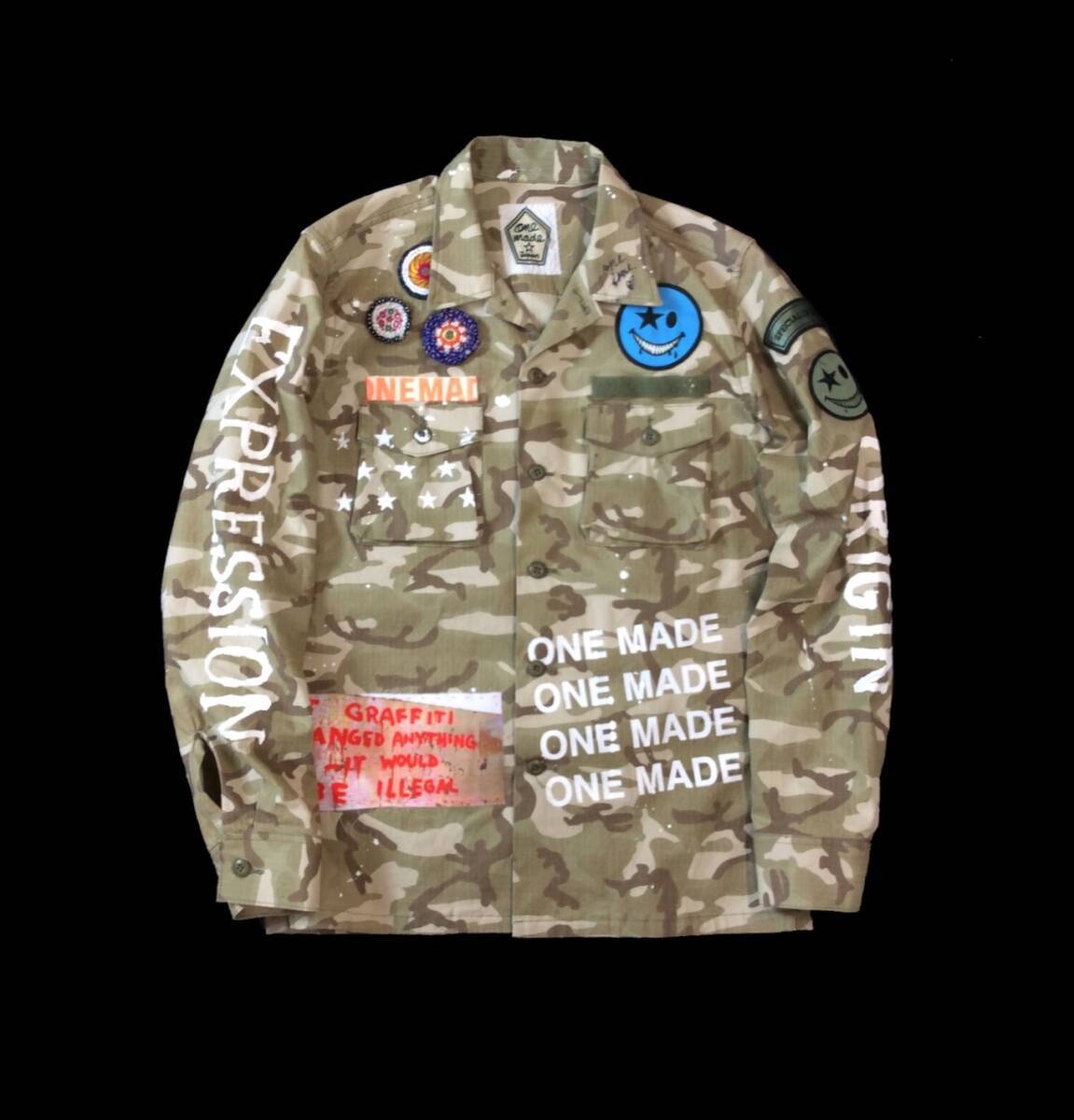 > ONE MADE ワンメイド ハンドペイント 長袖 シャツ ミリタリー ジャケット カモフラ 迷彩 ワッペン ブラウン系 メンズ M