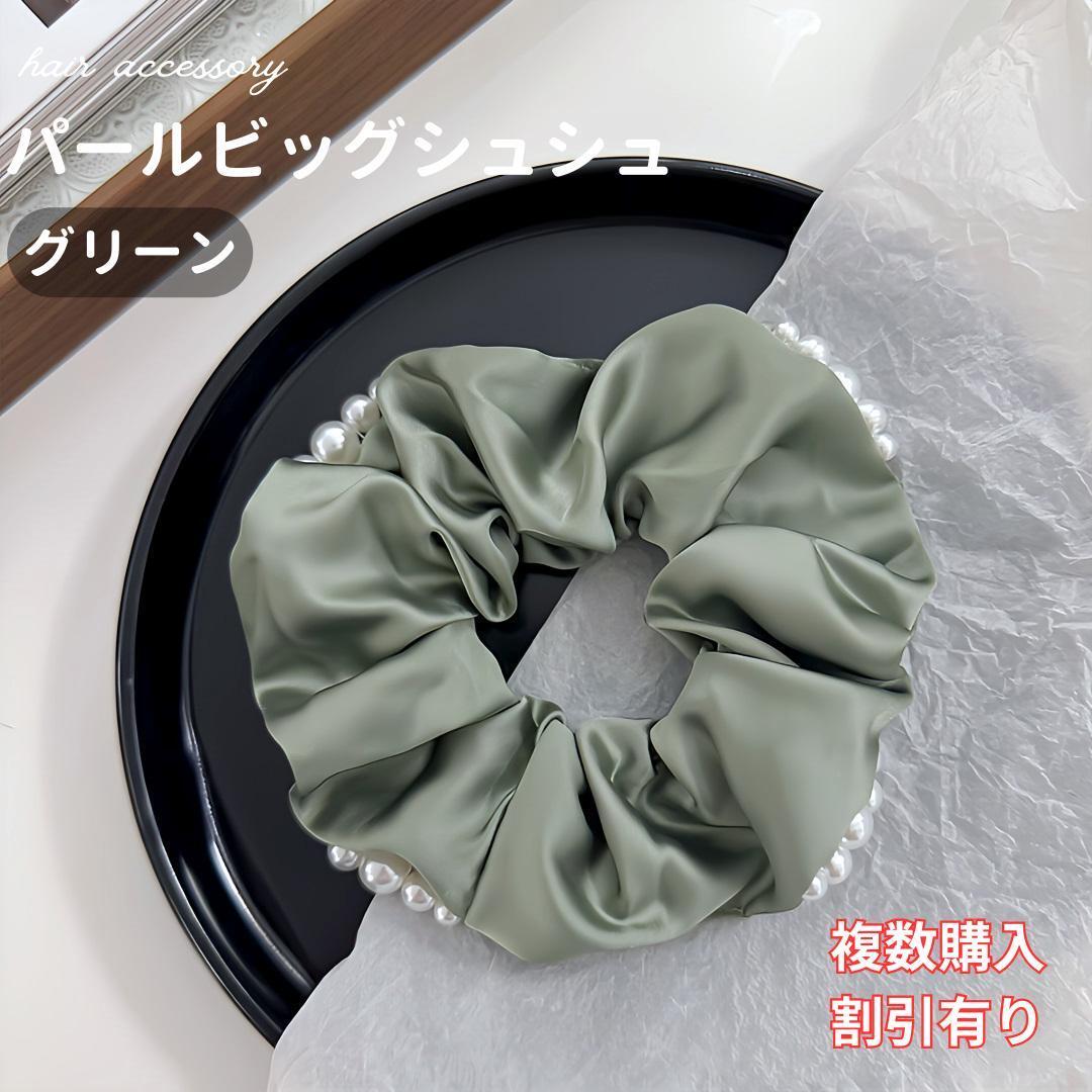 - ヘアアクセ 大きめ シュシュ グリーン ヘアゴム パール リボン 髪留め 髪飾り おしゃれ