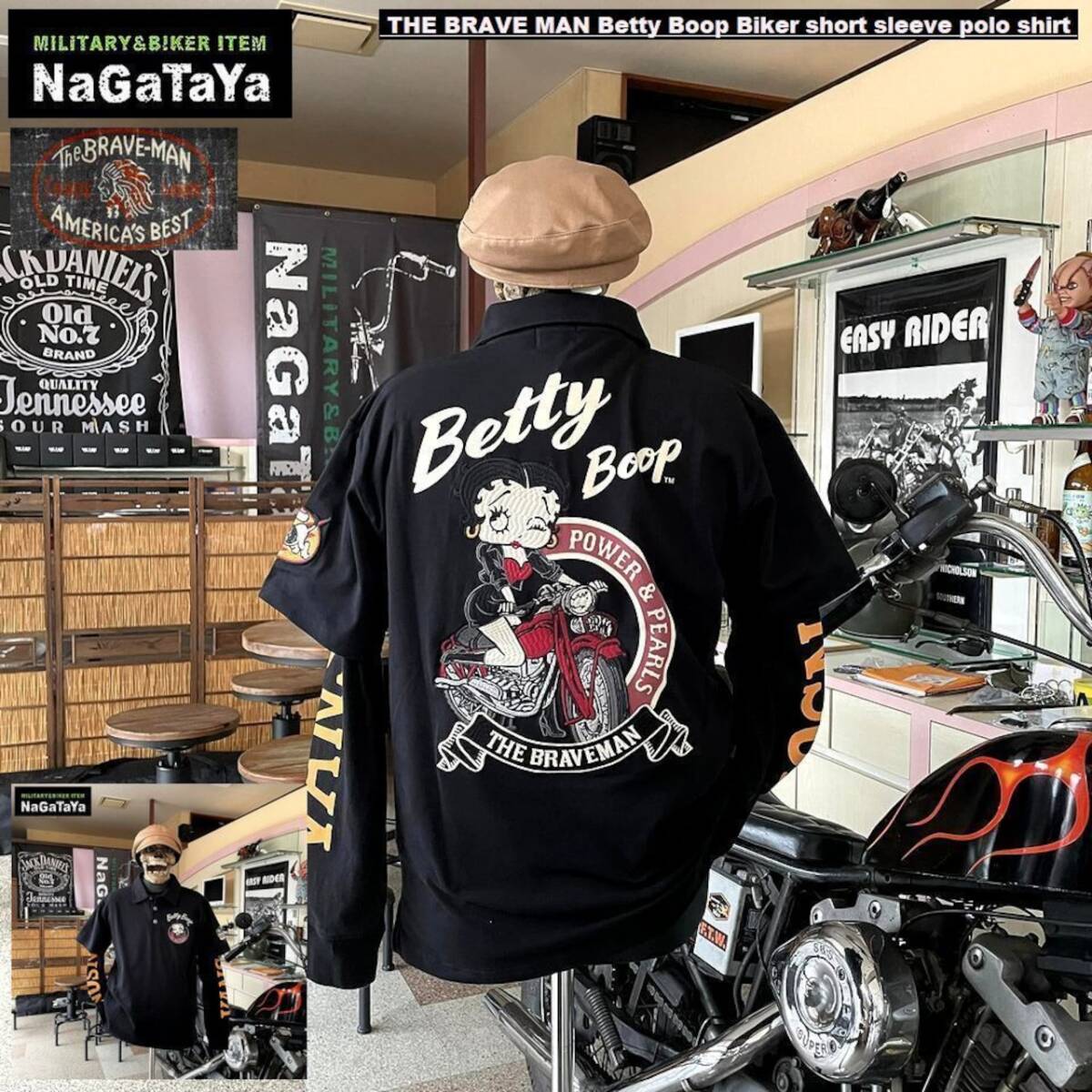 - THE BRAVEMAN BETTY BOOP ブレイブマン ベティブープコラボ ロゴ刺繍 ベア天竺 バイカー半袖ポロシャツ ブラック Lサイズ BBB-2422