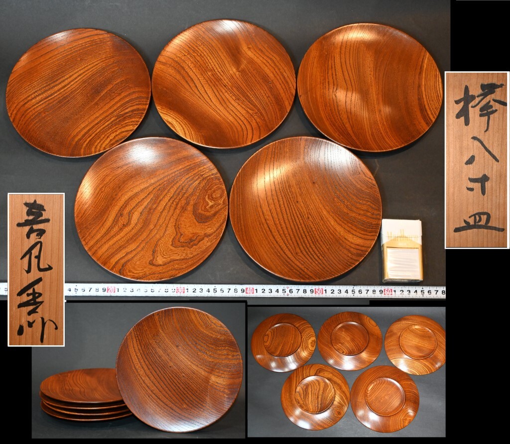 - 女流漆芸家■音丸香 作■ 欅 八寸皿 五客揃 共箱 父は人間国宝音丸耕堂 一客難有 丸皿 ケヤキ 木製 漆器 漆芸 真作
