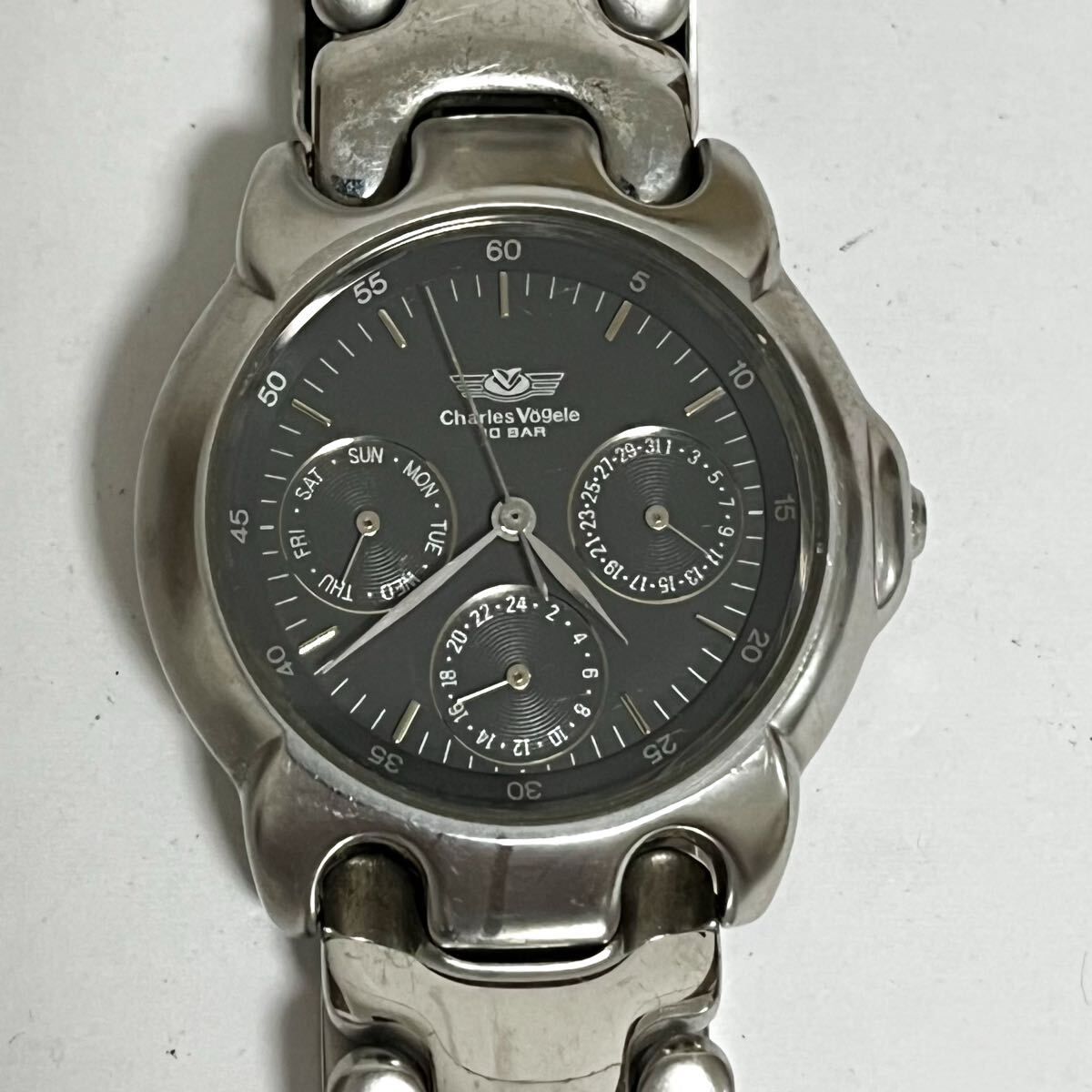 > 和822C★ Charles&Vogele CV-7378 シャルルホーゲル クォーツ 3針 クロノグラフ 腕時計 ウォッチ ダークグレー メタルバンド メンズ