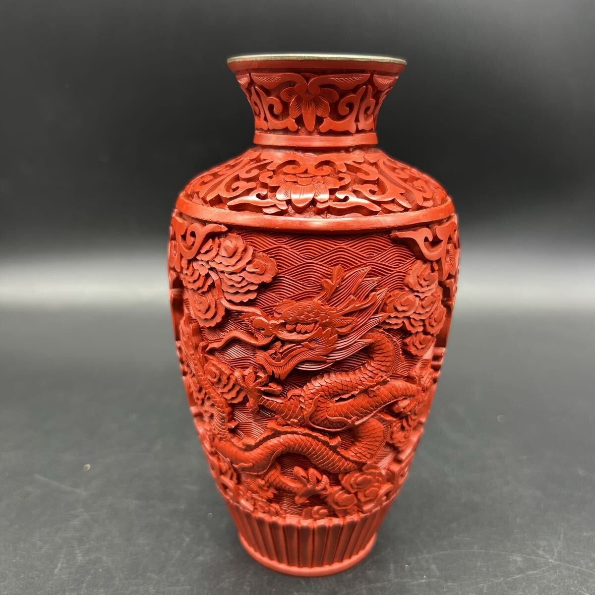 - 中国美術 堆朱銅胎 花瓶 花器 龍彫 漆器 龍 彫刻 置物 インテリア エ32-8