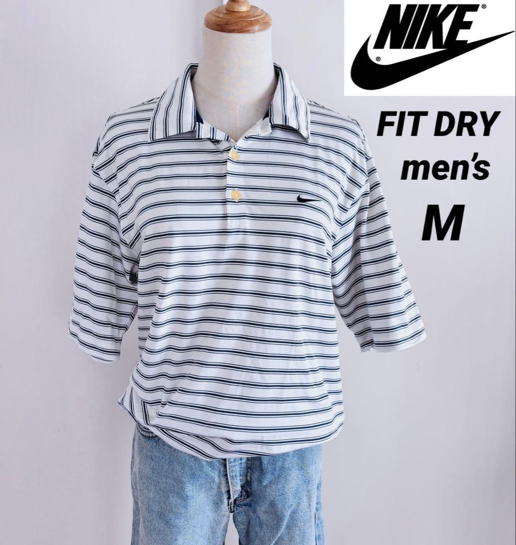 > NIKE FIT DRY ナイキ フィットドライ メンズ ゴルフウェア ボーダー 半袖ポロシャツ 刺繍ロゴ ネイビー M