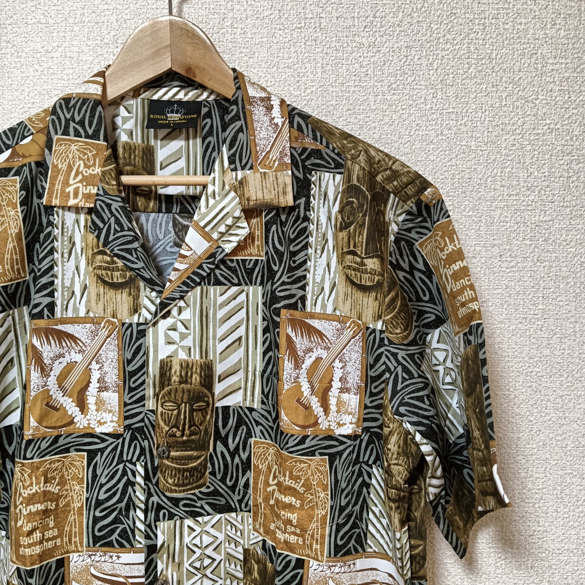 > 極美品★ロイヤルクリエーションズ 半袖 開襟 オープンカラー アロハ コットン ハワイアンシャツ 総柄 men's sizeL 未使用に近い 古着 USED