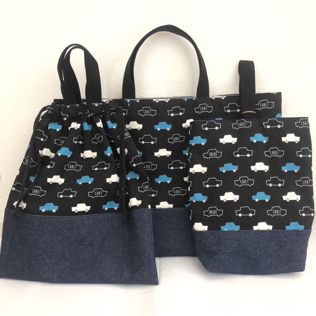 - 大きめ 3点セット レッスンバッグ、上履き入れ、巾着袋 車柄 黒 男の子