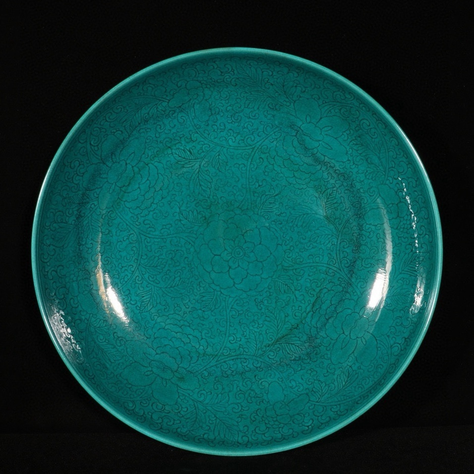 - 清時代 朝雍正年制 孔雀緑暗刻 絡枝花紋盤 高さ6.2 cm 直径28 cm 中国骨董 珍品旧蔵 古賞物 時代物 820