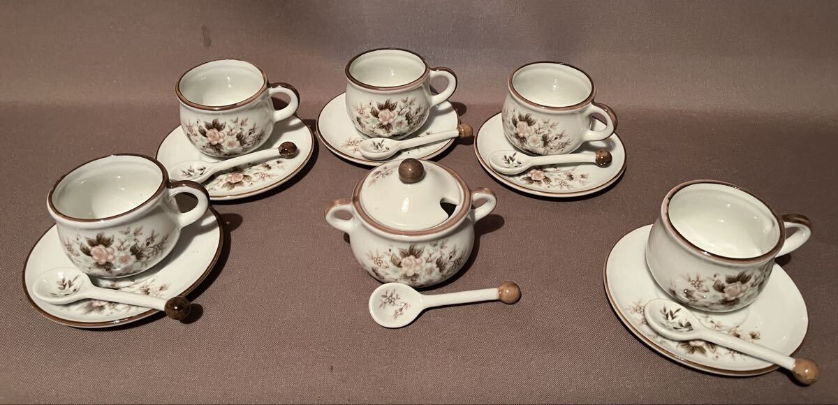 - デミタスカップ 5個 シュガーポット1客 合計6点セット 花柄 スプーン付き アンティーク 昭和レトロ