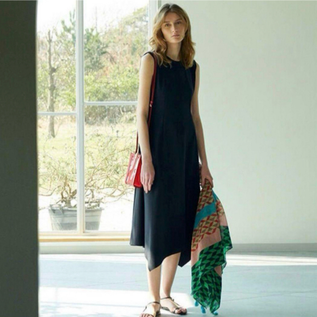 - 美品 セオリーリュクス ロングフレアワンピース アシンメトリー ランダムヘム ノースリーブ 速乾 ブラック 黒 38サイズ 洗える Theory luxe