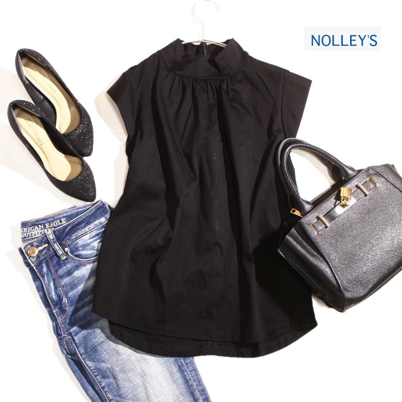 - 美品 ノーリーズ NOLLEY'S ハリ ストレッチ Tシャツ素材 コットン ハイネック ノースリーブカットソー 9号 38 ブラック 黒 オフィス 通勤