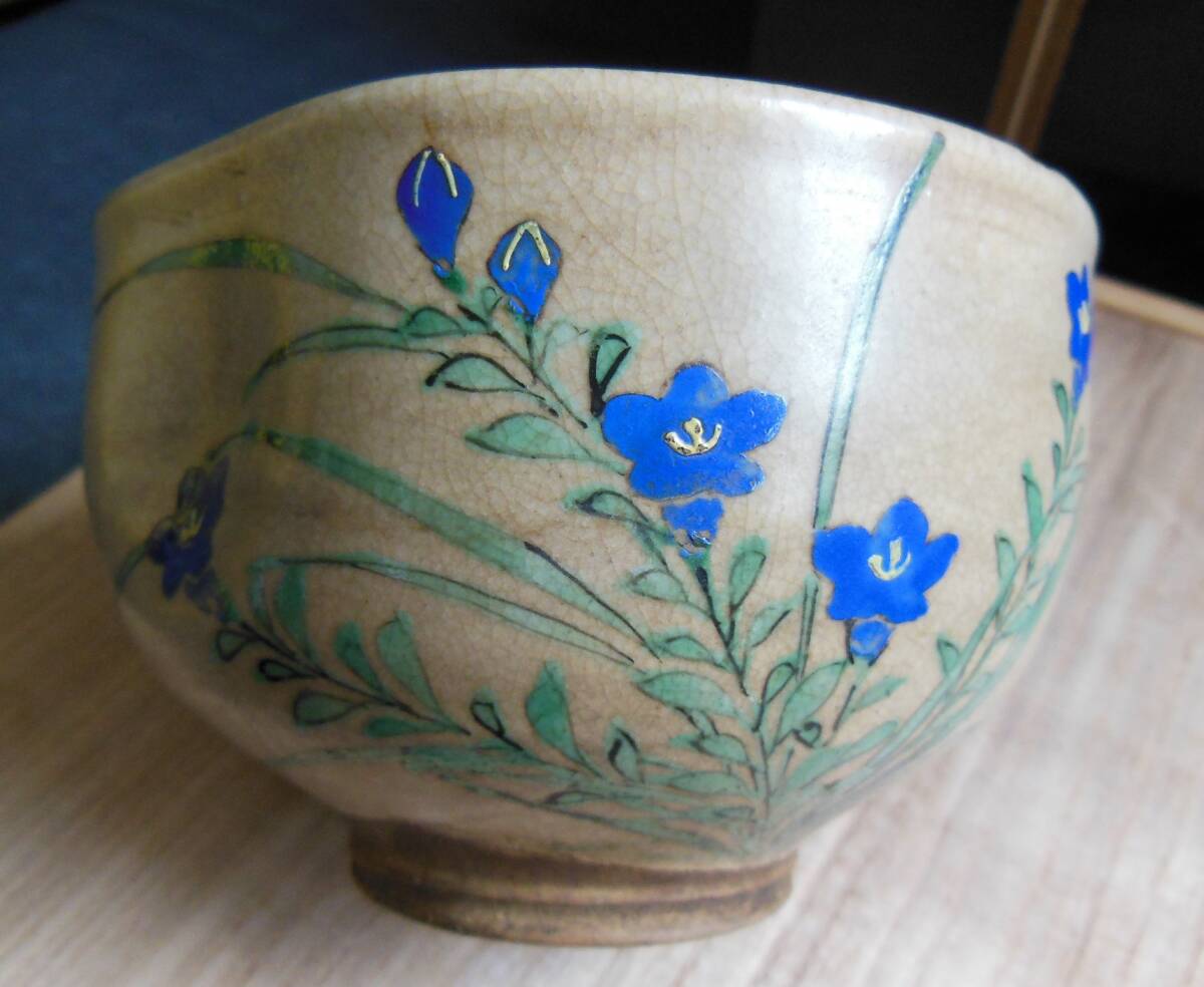 - 楽山焼 二代 長岡空斎 松平不昧公 桔梗絵付け 茶碗 空権極め有り