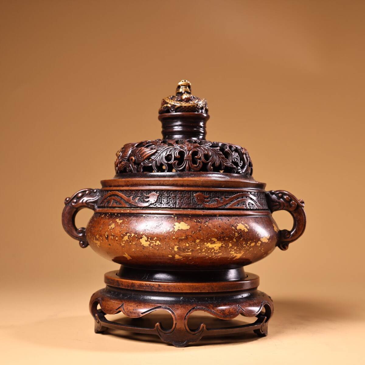 - 『館蔵珍品 銅製 塗金 雙耳 熏香炉 箱付 置物 賞物』稀少珍蔵品 古賞物 貴重物品 収蔵品 中国古美術 時代物 古董品