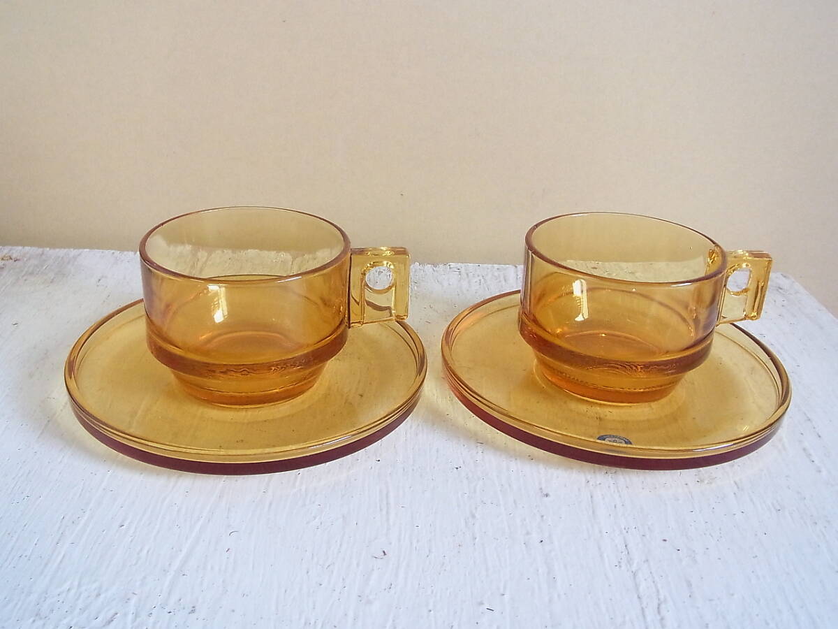 - カップ&ソーサー 2セット ☆アンバーガラス 佐々木硝子