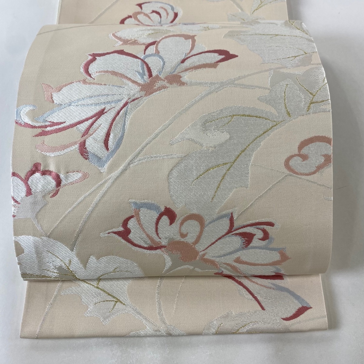- 袋帯 美品 秀品 落款 織匠絹屋 草花 刺繍 金糸 ピンクベージュ 六通 正絹 【中古】