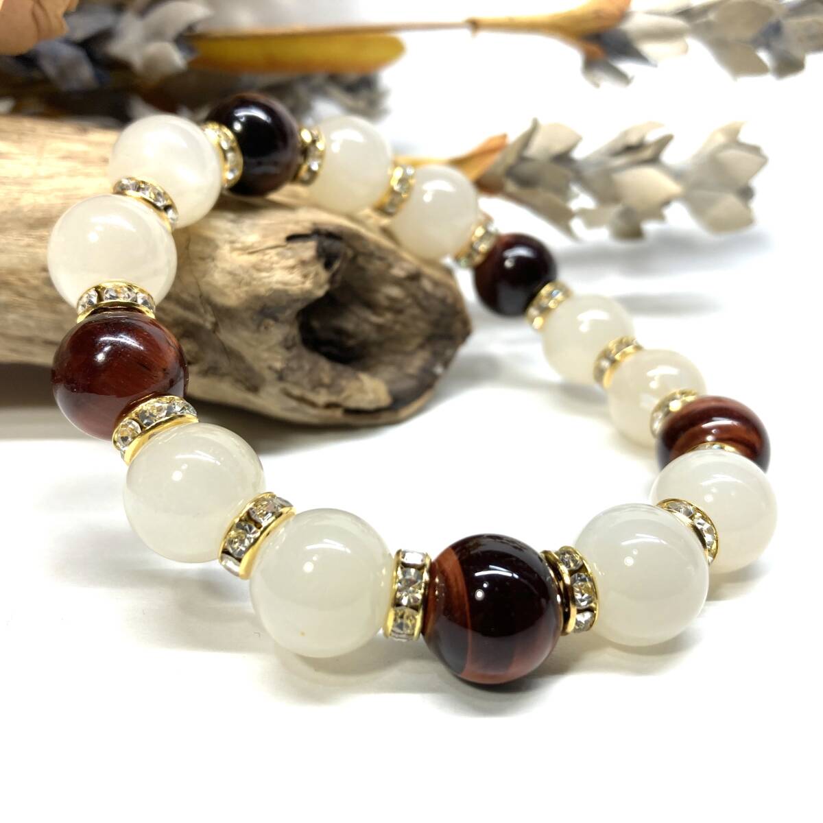 - ムーンストーン&レッドタイガーアイ パワーストーン ブレスレット 天然石ブレス (ゴールド) 12mm 幸運 開運 メンズ 男性♪
