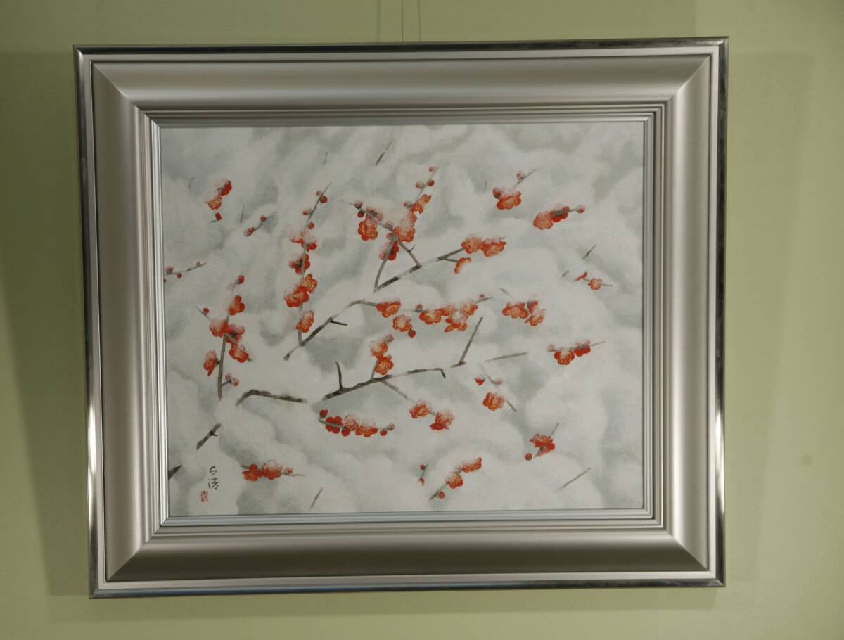 - 【猫拳】〔『雪紅梅』佐藤太清先生 芸術院会員 額(多聞堂)共差箱 シール 共雌伏 良好 福知山市出身 記念美術有〕真作保証