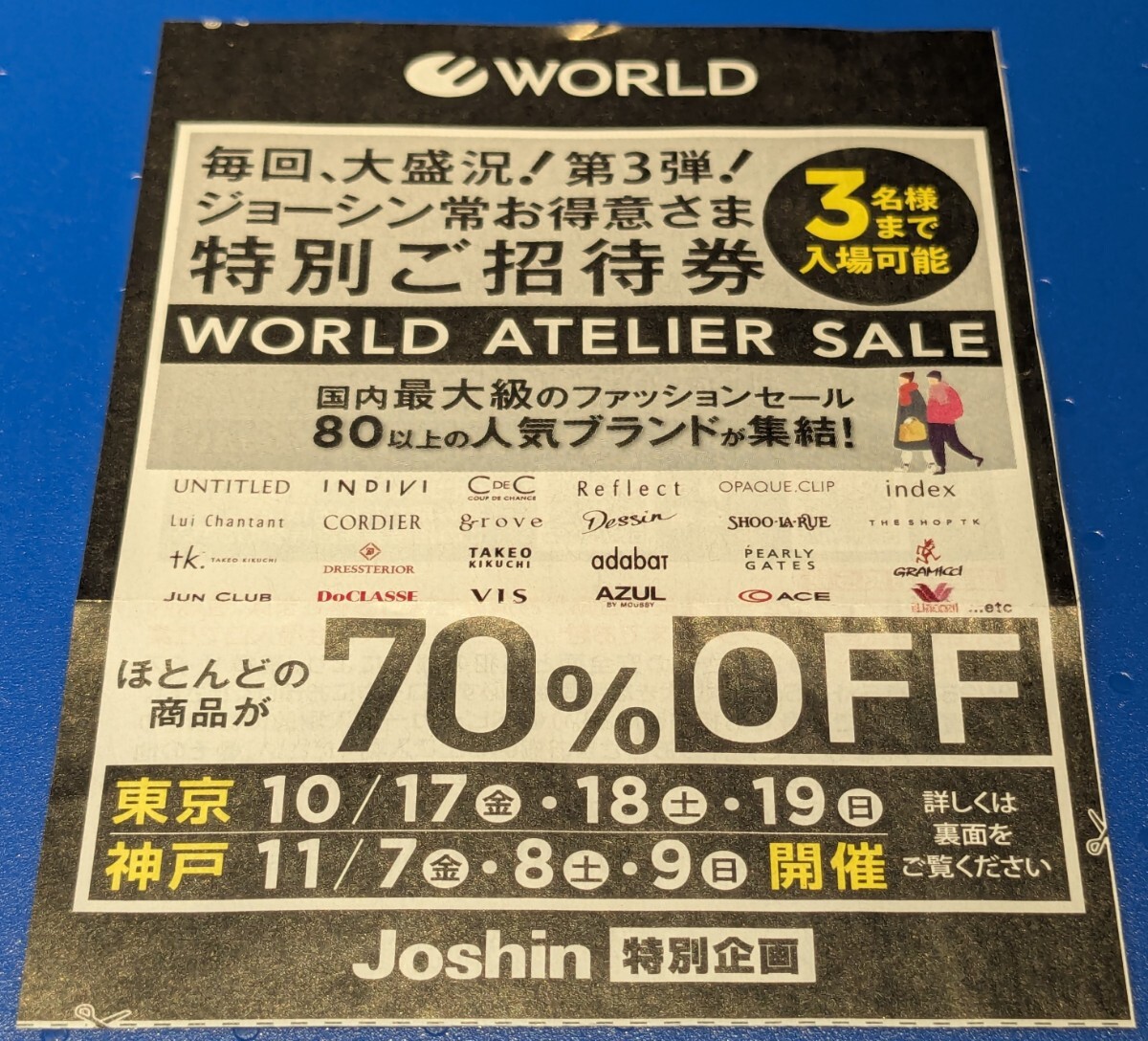 - WORLD ATELIER SALE ★特別招待券★東京 10/17,18,19★神戸 11/7,8,9★ワールドアトリエセール★ワコール★ACE★adabat★UNTITLED★INDIVI