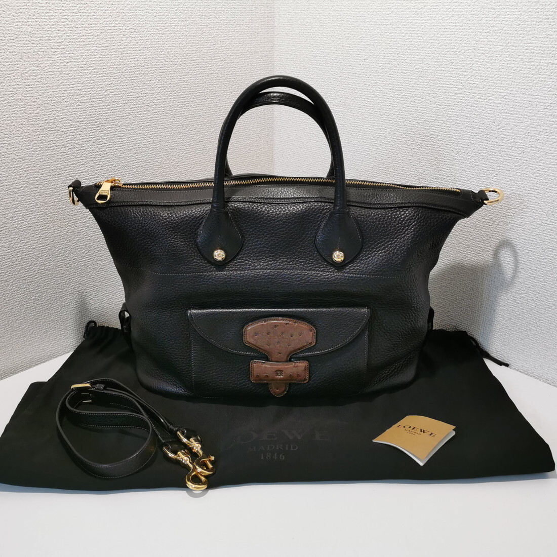 > 170823S83-0826S□LOEWE ロエベ□メイ レザー/オーストリッチ ブラック/黒 ゴールド金具 ハンドバッグ ショルダーバッグ 2WAY