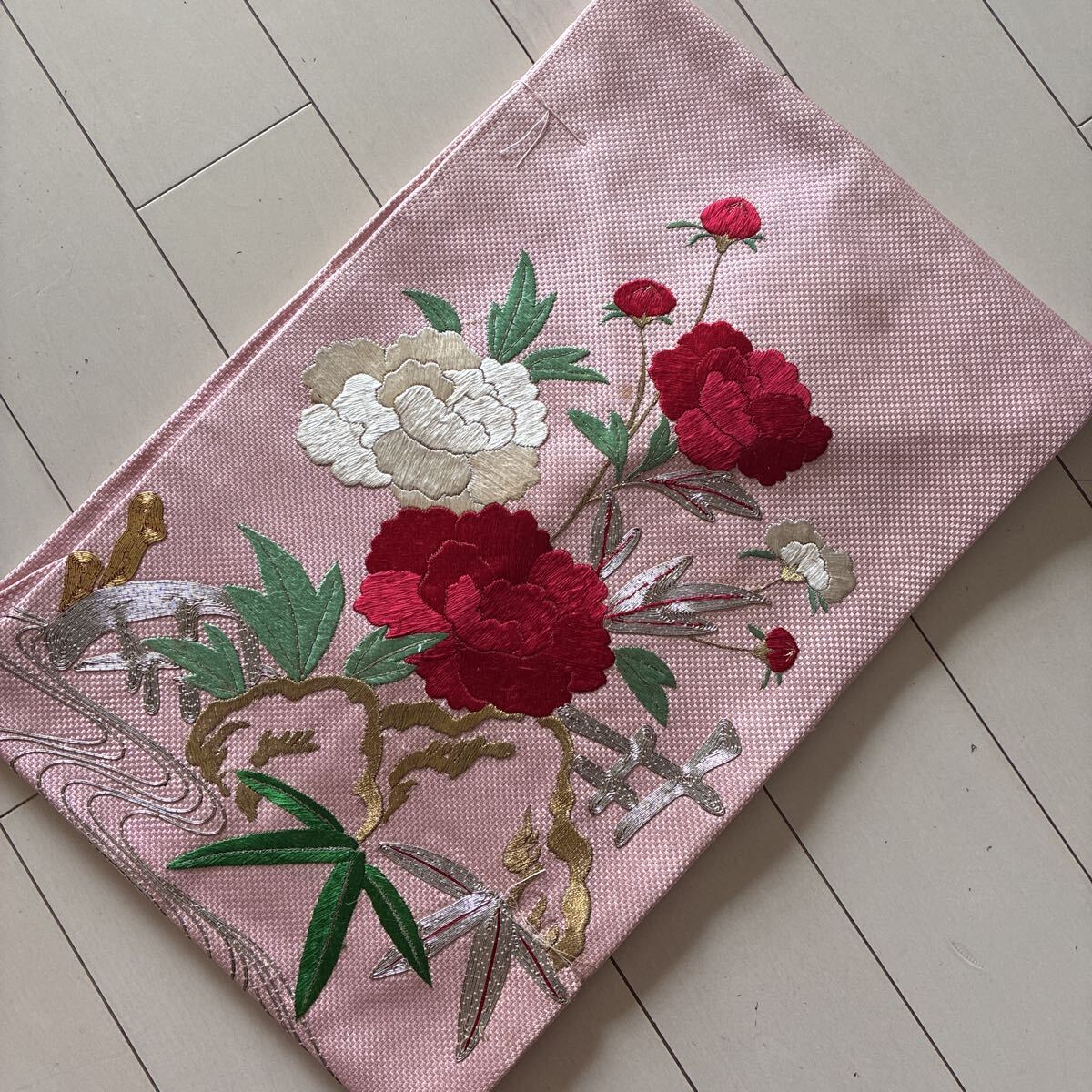 - ■C873■アンティーク■正絹■桜色 金糸・銀糸 全刺繍 牡丹柄 名古屋帯■手刺繍
