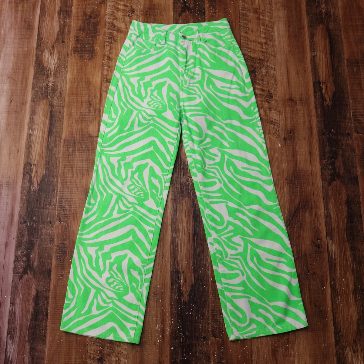- 美品 シーイン SHEIN ゼブラ柄 ストレートパンツ レディース アニマル柄 ハイウエスト ストリート XSサイズ ネオングリーン ホワイト QF2