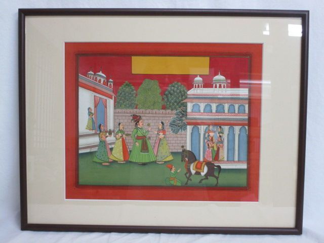 - 雉坂★【 インド宮廷絵画 額 インド細密画 彩色 紙本 】アンティーク・絵画・宮廷の女性たち