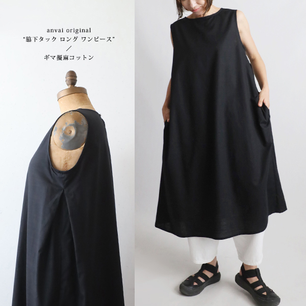 - 秋SALE 116cm丈ギマ擬麻コットン 脇下タック入 ロング ワンピース ノースリーブ ゆったり F21C
