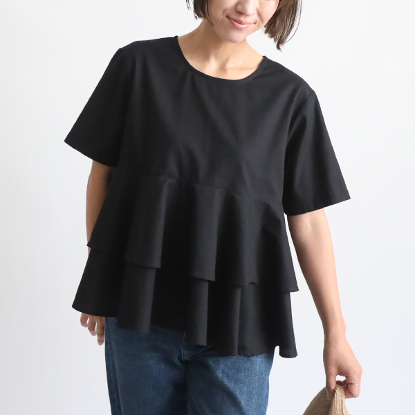 > 秋SALE 上質ギマ擬麻コットン ティアード フリル ブラウス ゆったり プルオーバー シャツ ブラック 半袖 お洒落 F14C
