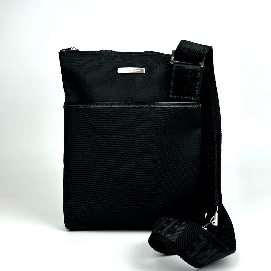 > 極美品●Salvatore Ferragamo フェラガモ ショルダーバッグ シルバー金具 斜め掛け レザー キャンバスナイロン 黒 ブラック フォーマル