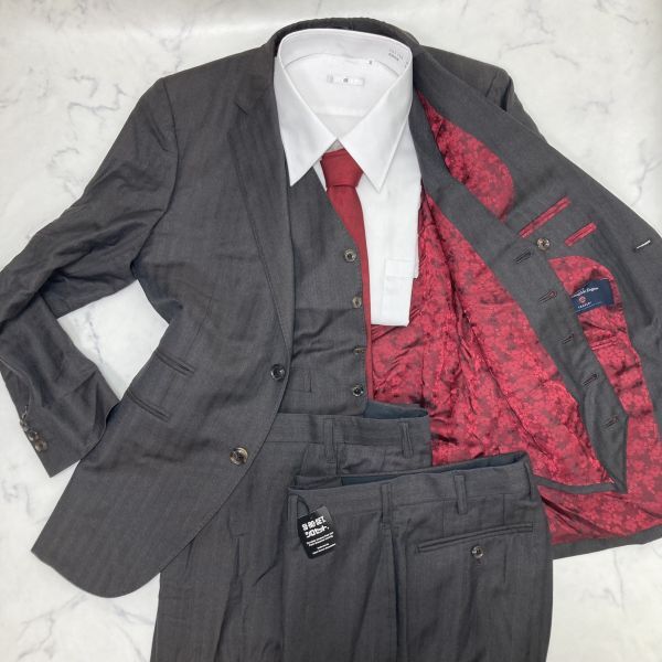 > 新品 エルメネジルド・ゼニア 2パンツ 3Pセットアップスーツ ベスト 裏地花柄 シャドーストライプ 暖色系グレー 通年 B1263
