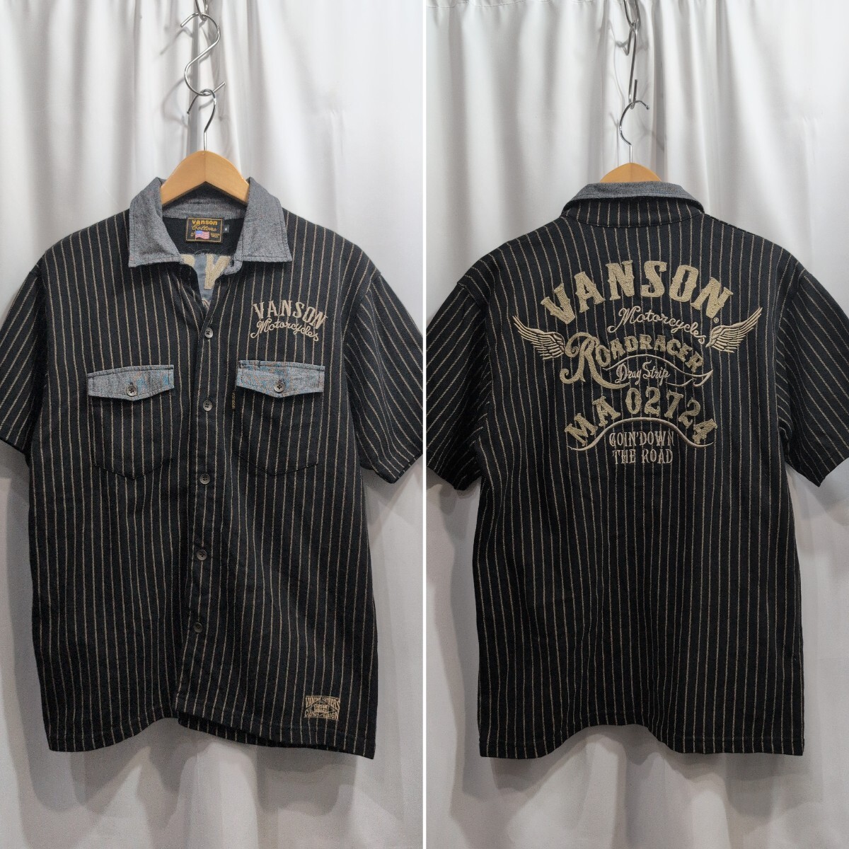 > 良品 VANSON バンソン 刺繍 ストライプ 半袖ワークシャツ M メンズ 半袖シャツ モーターサイクル コットン ブラック/ショット/ノートン