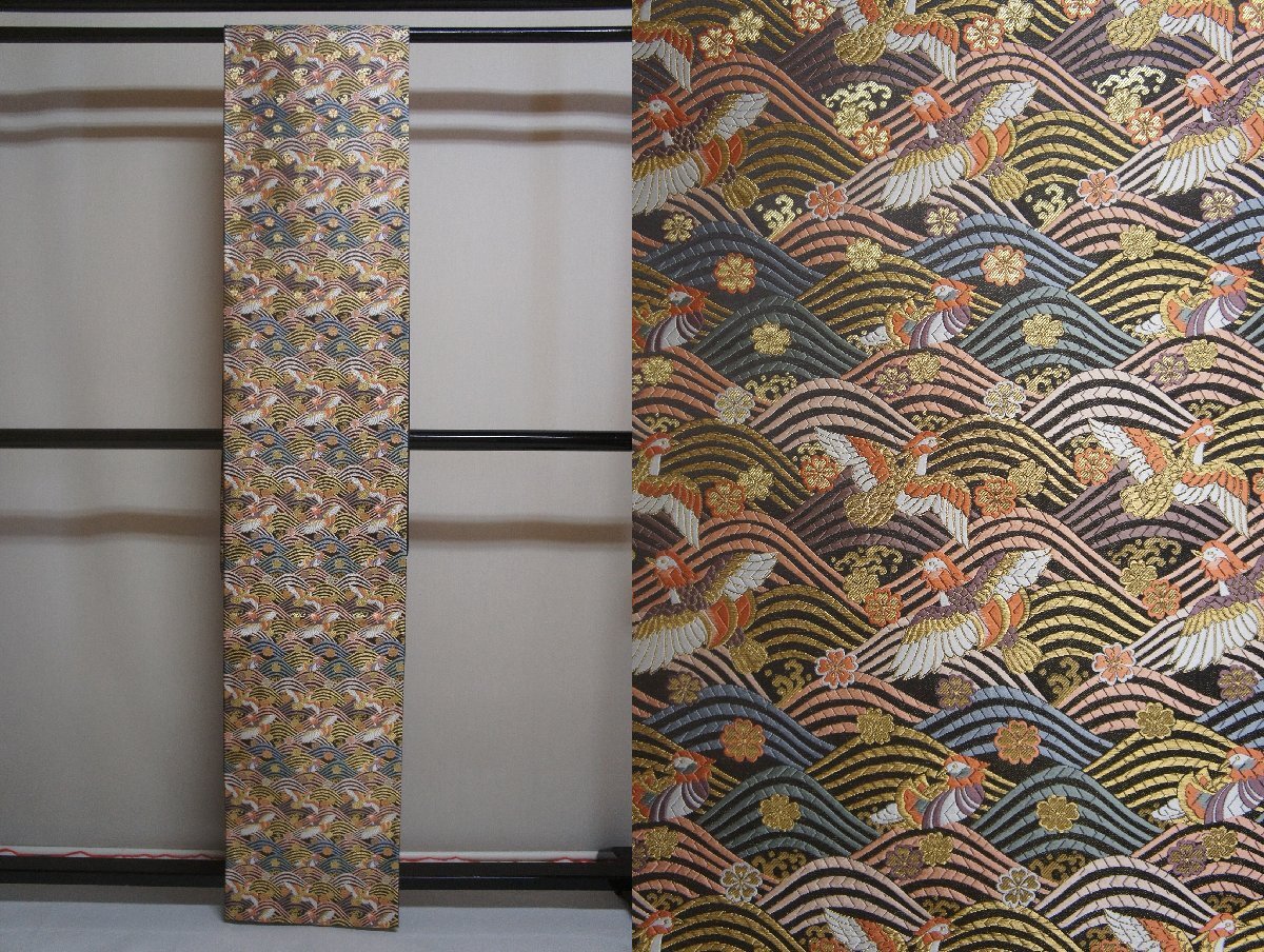 - 『織匠十一代目篠屋宗兵衛』正絹黒ねず色地波に鴛鴦模様未着用袋帯[O16436]