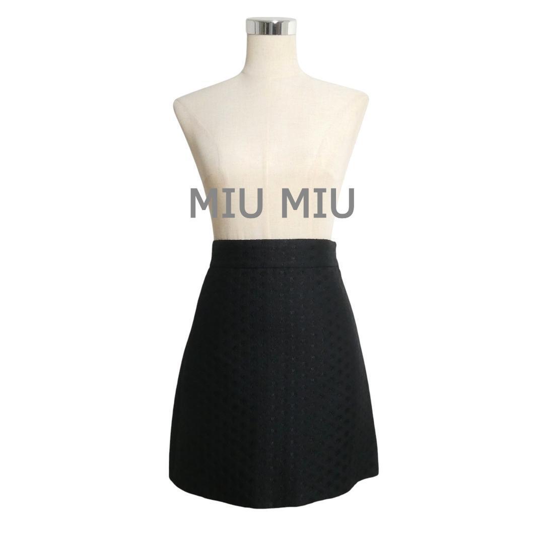 > 美品 MIU MIU ミュウミュウ サイズ38 花柄 ジャガード 総柄 膝丈 台形 スカート 黒 ブラック