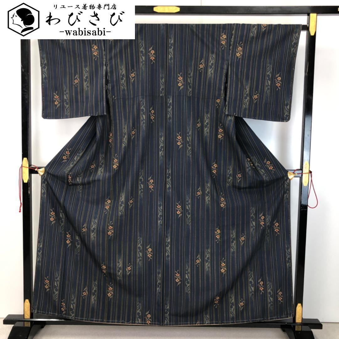 > 小紋 縦縞模様に花模様 濃紺色 縮緬 しつけ糸 K-5238 着物 きもの kimono 和服 和装 中古 リサイクル着物 【送料無料】