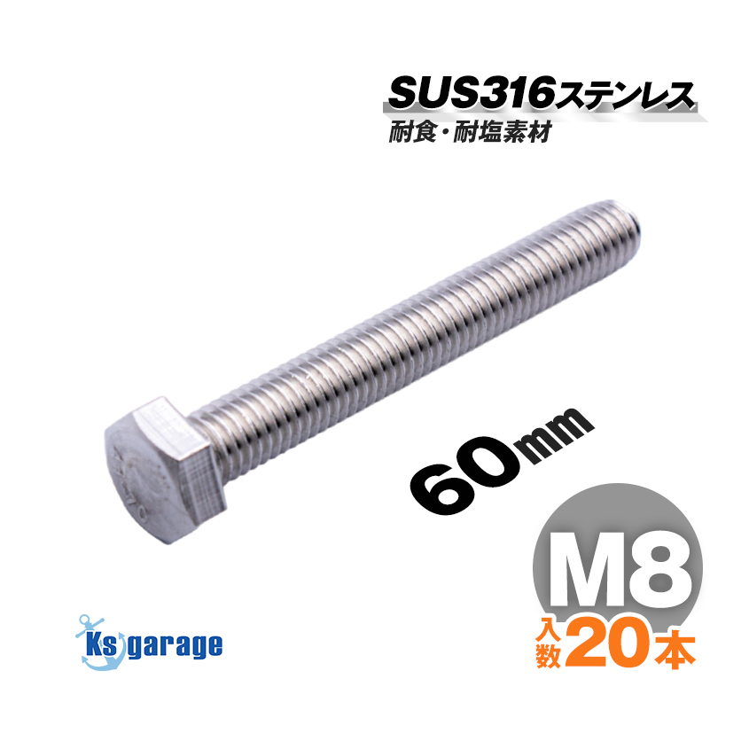 - SUS316 ステンレス ボルト M8×60 P1.25 (20本セット) 六角ボルト 全ネジ 船 ボート 船舶 艤装用 固定 ネジ マリングレード ステンレス