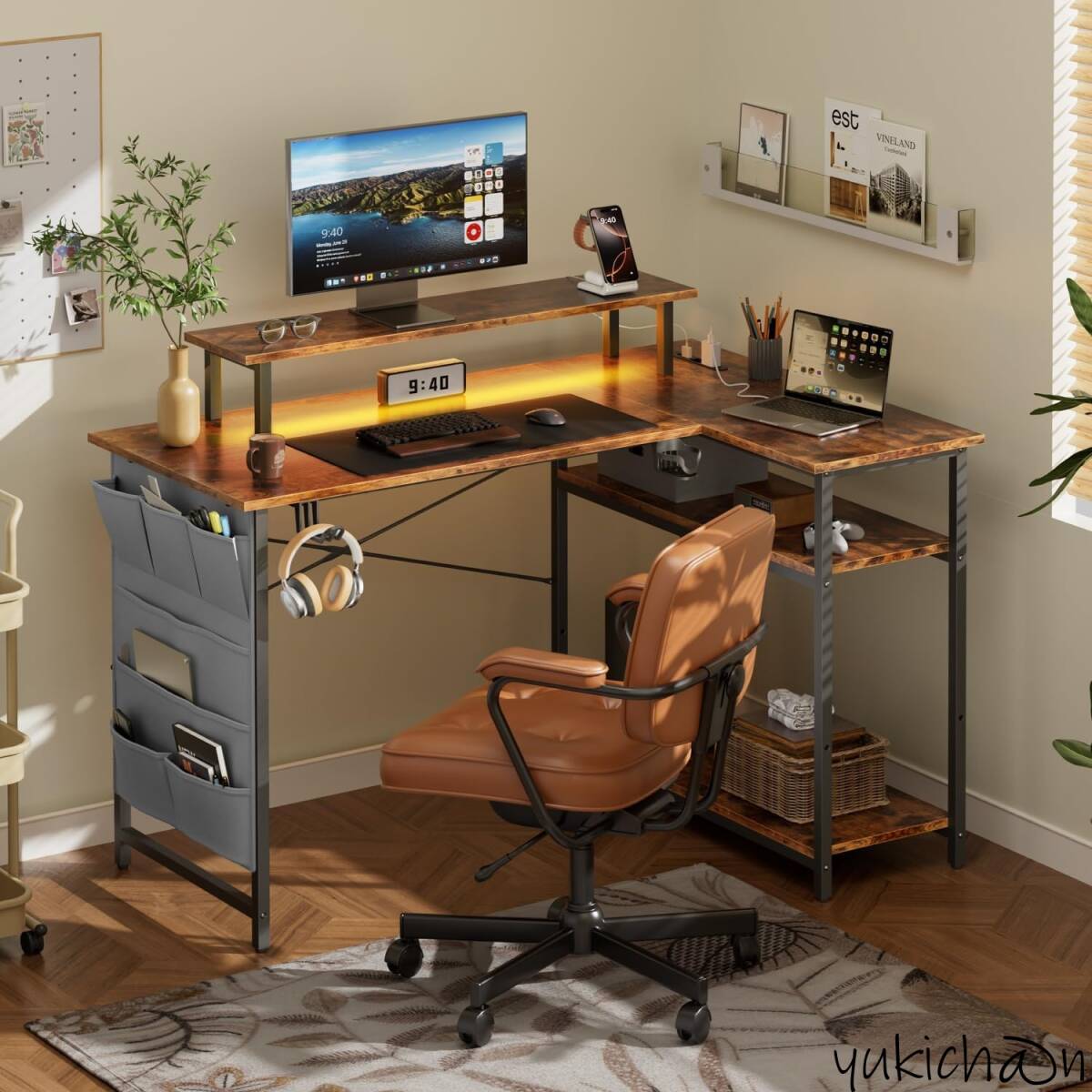 > L字型PCパソコンデスク タイガーストライプ 110cm×80cm ゲーミング事務机 電源コンセント LEDライト モニタースタンド 簡単組み立て
