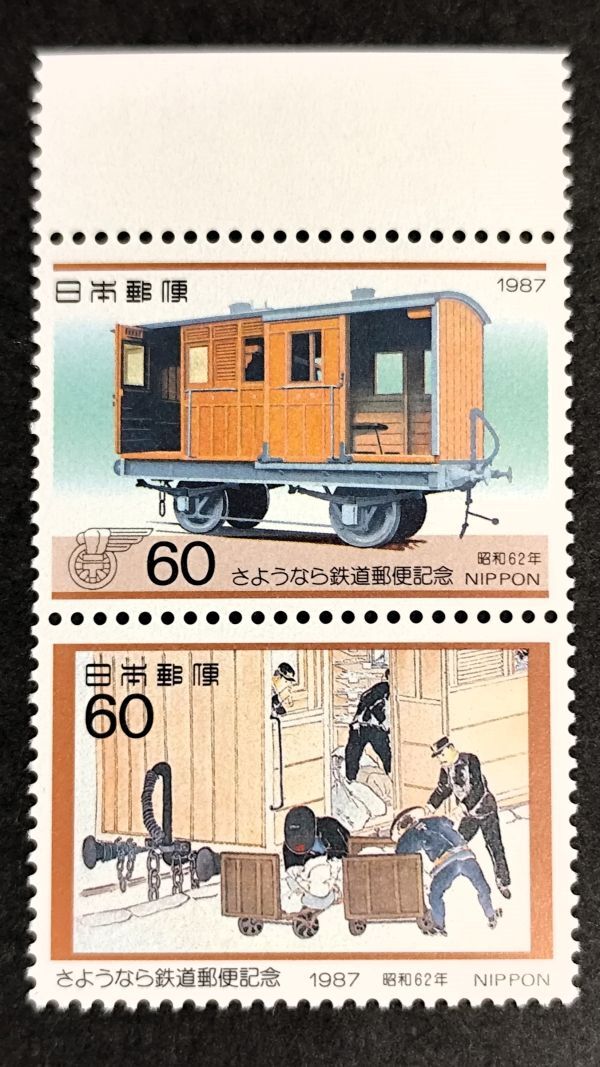 > [25090235]【さようなら鉄道郵便記念】2種連刷「明治時代初期のユ3700形 鉄道郵便車・郵便現業絵巻」60円×2 1987年発行 美品*