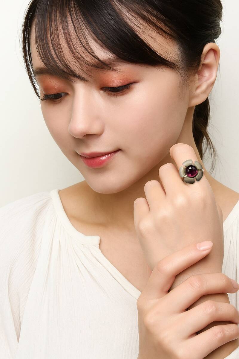 - 60's Ziggy Originals NYC 大きなお花 ヴィンテージ フラワー リング 指輪 ピューター製 マゼンタ石 大ぶり フローラル 自然派 Y13-D