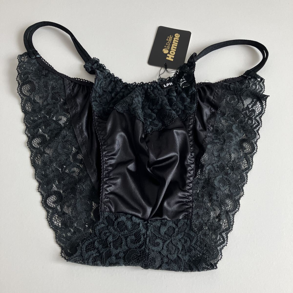 - ラポームオム メンズ La-pomme homme 光沢フェリカ生地 メンズフルバックショーツ 透け感レースでセクシー&エレガント ブラック M