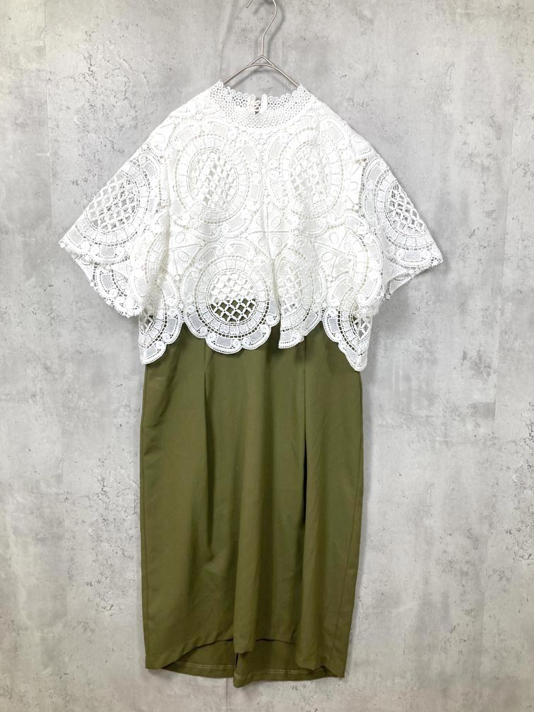 > ゆうパケットOK 美品 FLOLIA フロリア flo-fu-029 サークル柄レース&シフォンのセットアップ風 ワンピース sizeM/白×カーキ ■■