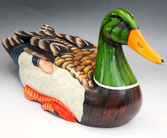 > M682Mちょる☆カモの木製の置物 デコイ 鴨 水鳥 天然木 ハンドペイント 前後47cm アンティーク 木彫 decoy duck アヒル ビンテージ