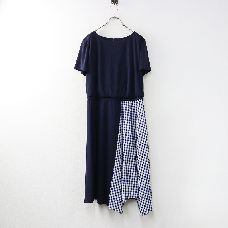 > 近年モデル 大きいサイズ インディヴィ INDIVI 半袖 チェック 切替 ワンピース 42|ネイビー ドレス ノーカラー【2400014569650】
