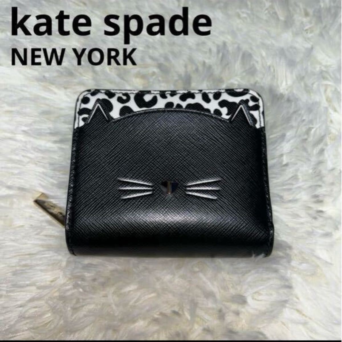 - 美品 kate spade NEW YORK、折り財布、ブラック、猫、ネコ、レオパード、ねこ