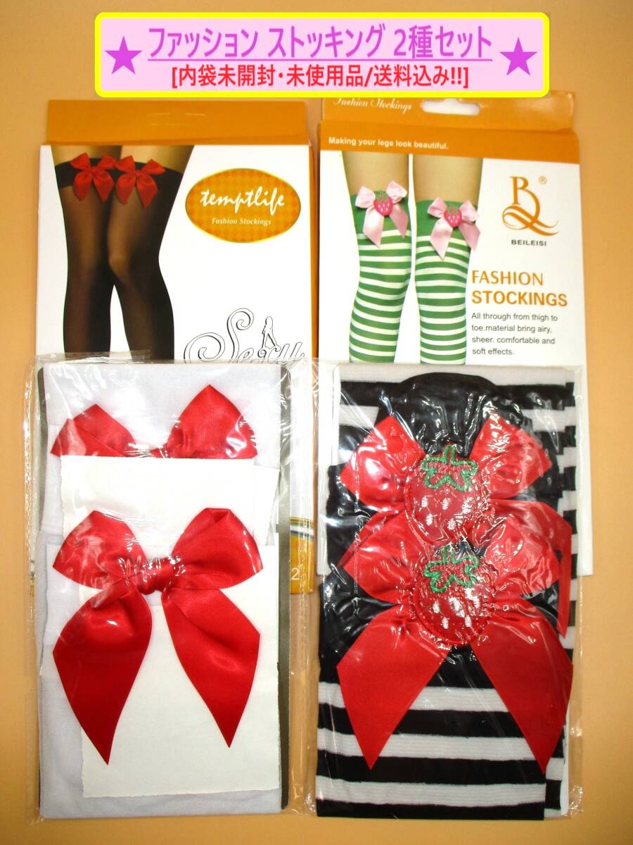 > 訳あり 未開封 ファッション ストッキング リボン 飾り 2種 D 長期保存 かわいい タイツ ニーハイ 赤 いちご 白 黒 ボーダー 縞模様 海外製