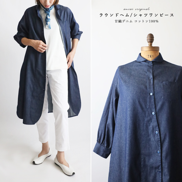 - 送料無料 秋の新作 甘織デニム 小ぶりな丸襟 変形 ボタンライン ロング シャツ ワンピース ラウンド裾 前開き R89