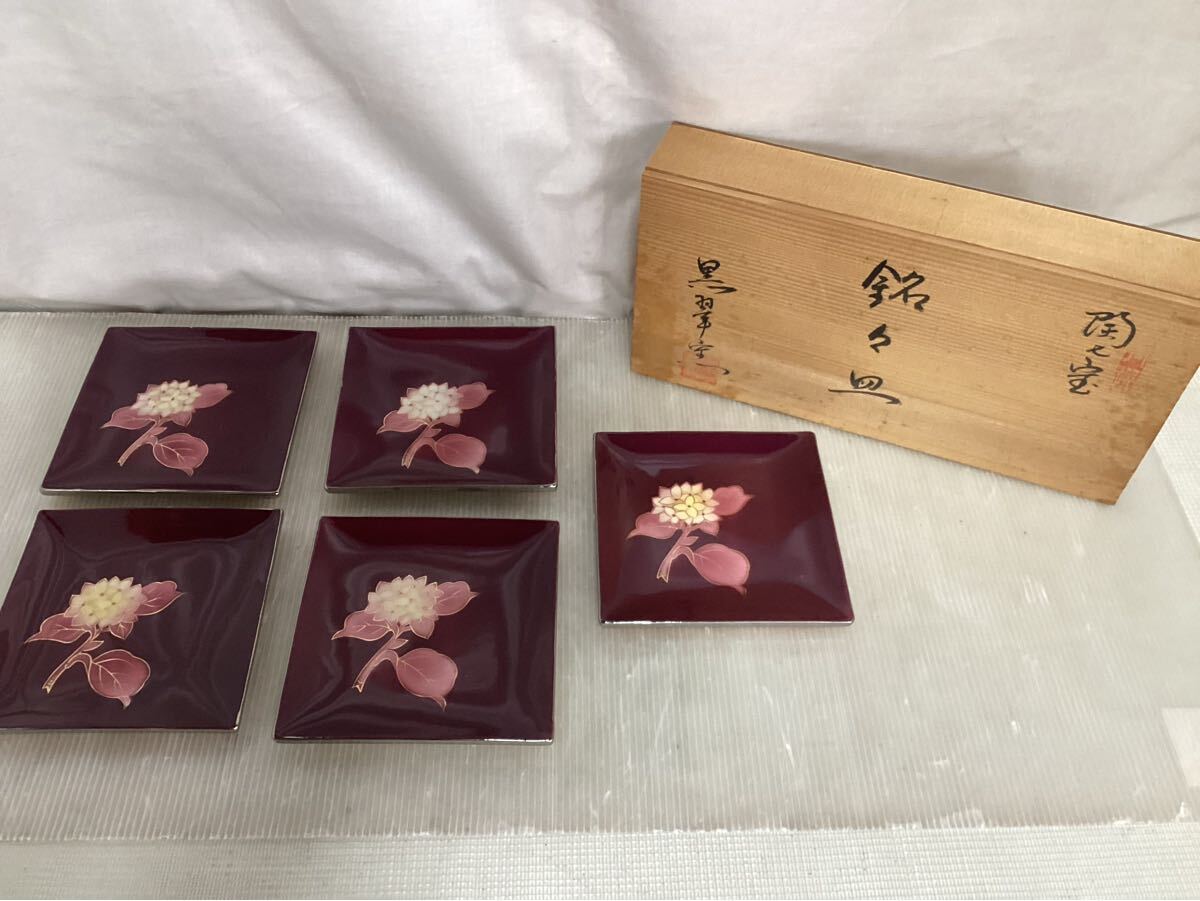 - 【K0667】七宝焼 銘々皿 黒翠 菓子皿 角皿 箱入り未使用 和食器