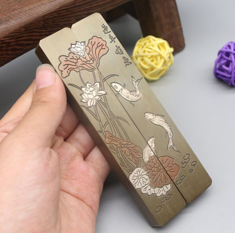 - 蔵友旧蔵出 黄銅製 連年有餘紋 鎮尺一對 希少珍品 貴重品 置物 古賞物 密宗密教 供養品 仏教美術品