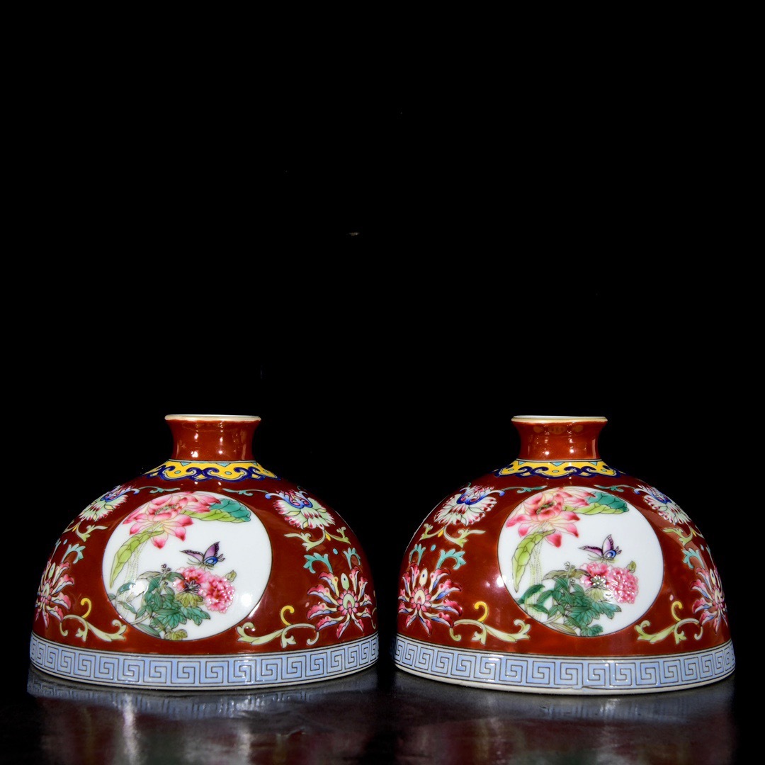 > 9_ZZ8436【惠】人間国宝 中国骨董 陶芸 磁器【清雍正琺瑯彩開窓花蝶紋馬蹄尊一対】工芸品 施釉陶 青花磁 陶芸 置物 收藏品