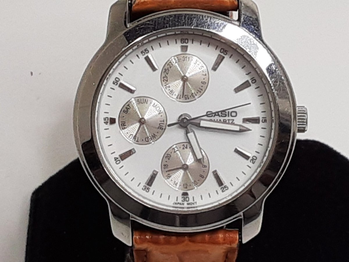 > カシオ CASIO メンズ 腕時計 デイデイト トリプル カレンダー MTP-1192 白 ブラウン SS レザー ブレス アナログ クォーツ【中古】 ht5338
